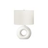 Add some modern ambiance to your home with this stylish and trendy 24"h table lamp in a matte white ceramic with a chic ivory shade. This decorative table lamp will brighten up any room with its contemporary, donut-shaped ceramic base and oval linen-blend fabric shade. A perfect size to place on an end or side table, or as a bedside lamp on your nightstand, this lamp will illuminate your space with a soft and inviting glow. Easy to use with an on/off rotary switch that houses a 100W light bulb (not included), this lighting fixture will easily be a standout. With only minimal assembly needed and backed with a 2 year limited warranty against manufacturer defects, you can trust in the quality and durability of this unique accent piece.