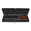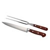 This serving set is designed to allow you to easily lift, turn and carve poultry and roasts. It includes a sharp knife and a fork with a wooden handle. The set lays in a black case with a latch on the front side. There is foam in the inside of the case for protection.