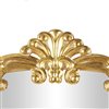Place this golden ornate floor mirror in a sunlit parlour or at the end of an elegant corridor, its radiant reflections and intricate detailing will create an enchanting focal point. This item ships in one carton. Actual mirror dimensions are 23-inches wide by 44 inches high. It can be hung vertically using the keyholes; nails and screws are not included. Suitable for indoor use only. This item ships fully assembled in one piece. Made in India. This is a single gold coloured freestanding mirror. Vintage style.