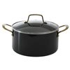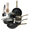 This 14-piece cookware set from Martha Stewart has all the essentials for everyday cooking. The heavy-gauge aluminum construction provides outstanding durability and even heating performance. It is also constructed with a triple-layered reinforced nonstick coating, providing long-lasting food release and easy cleanup. The exteriors are finished in a vibrant porcelain enamel that resists stains and wipes down easily. Perfect for a wide range of recipes, this versatile cookware is oven safe so you can go from the stovetop to the oven to table. The triple-riveted handles provide sturdy grips for safer handling, and tempered glass lids allow safe monitoring of the cooking process. This signature Martha Black cookware set will add a pop of style and performance to your kitchen.