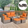 - This 8-piece patio set includes 2 corner sofas, 2 single sofas, 2 footrests and 2 brown tables