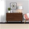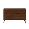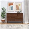 The Prepac Milo 7-drawer dresser is a modern take on a retro look, with a sleek mid-century modern design that adds a touch of vintage to your bedroom. Three small drawers on the top row are well suited for personal clothing, while the 4 large lower drawers have ample room for sweaters and larger items. All seven drawers run smoothly on metal glides, offering easy access to storage for clothing and bedroom items. The tapered solid wood legs and inset drawers deliver a clean and modern look to your bedroom. Brushed brass finished knobs add to the retro-chic design for a functional and fashionable dresser. Style this dresser on its own, or combine it with any of the products in the Milo collection for a timeless look.