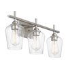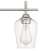 This 3-light vanity light brings a boost of brightness to your morning and evening routine. It showcases a clean-cut rectangle-shaped backplate that has a reversible mounting feature. Attached to the plate is one straight horizontal arm that holds three clear wine glass-shaped shades. Each shade accommodates one medium-base bulb up to 100 watts that aims to light up, down, or horizontally in the main bathroom or guest room. Plus, it's compatible with a dimmer switch, allowing you to adjust the lighting to your liking.