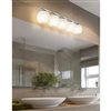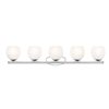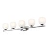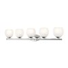 Sophistication lives in every curve of this transitional 5-light vanity bath fixture. Its rounded shades, in thick glass with a feathered opaque white swirl pattern, diffuse illumination for inviting ambiance that's ideal for daily ablutions. Its frame features a curved wall plate, straight bar, and cupped metal details, all in a gleaming chrome finish for timeless elegance.