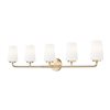 Put the finishing touches on your bathroom redesign with this impressive modern five-light vanity wall light. In a modern gold finish, it blurs the line between vintage and contemporary design schools, creating a chic look and feel over your vanity. Ribbed opal glass diffuses light for excellent ambiance, while a tall, tapering shade profile enhances the overall look of this charming sconce.