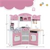 - This toy kitchen playset includes ample storage through top open shelves, hanging hooks, a spacious countertop and multiple storage compartments