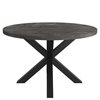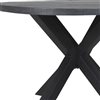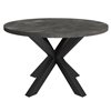 - Black iron table base with cross-legged design