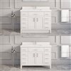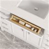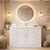 Upgrade your bathroom with a blend of modern design, smart storage, and durable craftsmanship. This premium freestanding vanity features a solid hardwood frame, an engineered stone countertop, and a sleek rectangular undermount ceramic sink for a timeless yet contemporary look. Soft-closing drawers and a patent-pending stealth organizer provide smooth functionality and organized storage. The 0.75-inch white engineered stone countertop with elegant grey veining is paired with a 4-inch backsplash to protect walls while adding a refined finish. Designed for easy installation, it includes contractor-friendly plumbing access, adjustable shelving, and customizable faucet configuration. Built with durable materials and premium zinc alloy hardware, it offers reliable performance and ample storage, backed by a 2-year limited warranty. Perfect for spa, master or guest bathroom upgrades. Note: Faucet, mirror, and pop-up drain not included.