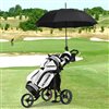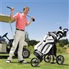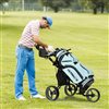This lightweight, sturdy steel golf cart features a wide body design with 10.5" rear wheels and 9.5" front wheels for balance and easy maneuverability. It has an adjustable handle, seat, and umbrella holder, and includes a large capacity storage bag with an insulated outer layer. Color: Grey. Material: Steel Frame, PP with EVA wheels. Dimensions: 51" x 29.5" x 39"-45.5". Front Wheel Diameter: 9.5". Rear Wheel Diameter: 10.5". Net Weight: 17.5 lbs. Max Weight: 30 lbs.