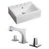 It features a rectangle shape. This vessel set is designed to be installed as a wall mount vessel set. It is constructed with ceramic and it comes with an enamel glaze finish in white colour. It is designed for a 3h8-in. faucet.