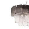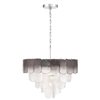 The chandelier from the Bianca collection exudes elegance with its cascading clear Piastra type glass panels that shimmer like delicate ice sculptures. The top row of glass features smoke panels while the rest of the grame features clear glass. The textured glass elements are gracefully suspended from a polished nickel frame, radiating a sense of refined artistry and grace.