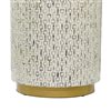 - Features a white circular body with multicoloured geometric pattern made of shells and a round gold base with anti-slip feet