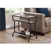 Giving both style and function without overwhelming your space, this contemporary side accent table gives an easy light and airy feel to a room. Framed in sturdy black metal with simple angular lines and finished with a graceful curve to the feet. Place a decorative object, plant or magazine on the tempered rectangular glass top for a welcoming appeal. The two open bottom shelves inserted with warm dark taupe MDF panels can easily hold a small stack of books or additional showpieces. Bring this end table into your living room, reading corner, family room, or even the bedroom as a place to store all your necessities within easy reach in an elegant design. Assembly is required.