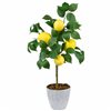 This artificial lemon tree in a grey pot offers enduring appeal and a modern aesthetic that transforms in Door and outdoor environments. Expertly crafted with lifelike details this faux lemon tree features intricately designed foliage and realistic lemon clusters that mirror nature's vibrancy. Product Features: Artificial potted mini lemon tree. Features bright lemons on sturdy branches. Bendable wire branches. It comes in a grey plastic pot filled with artificial moss and dirt. Recommended for in Door use only. No assembly required. Dimensions: 20-in H x 15-in W x 10-in D (fully fluffed). Pot: 4.25-in high x 4.5-in top diameter. Bottom: 3-in diameter. Material(s): plastic/metal. Note: Artificial lemons cannot be picked.