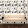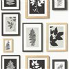 Instantly create a captivating gallery wall with this pattern. Black and white botanical prints are bordered by natural wood and black frames. Rumer is an unpasted, nonwoven wallpaper.