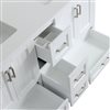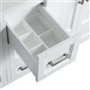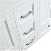 Bring timeless charm and modern utility into your bathroom with the Alaina 72-in Freestanding Vanity. Built with a solid wood frame and enhanced by moisture-resistant MDF drawer fronts, this piece combines durability with refined elegance. The soft white finish lends a fresh, versatile look that complements any design style. A premium white quartz countertop pairs seamlessly with an integrated ceramic sink and matching backsplash, offering a sleek and easy-to-clean surface. Thoughtfully designed for storage and functionality, it includes five soft-closing drawers and two soft-closing doors, ensuring everything has its place. Two handle options: Chrome and Matte Black are included to match your taste.
