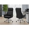 Designed for productivity and comfort, this modern office chair offers the perfect balance of support and style for your computer desk. The upholstered high back design, finished in a sleek black leather look, pairs with plush foam cushioning to create a truly comfortable seating experience. With adjustable height, supportive armrests, and an ergonomic structure, this chair adapts easily to your workspace needs. Unlock the tilt back lever to customize your recline up to three different positions when you need a break between tasks. A smooth swivel base and durable wheels allow for easy movement, while refined chrome metal details contribute to its durably designed construction. Thoughtfully made to be easy to assemble, this office chair is backed by a 5-year limited warranty, offering lasting quality and confidence in your everyday workspace.