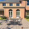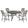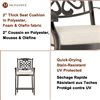 With this 5-piece dining set with seat cushions, you can enjoy a nice meal outside. The round table features a cast aluminum frame which resists rust and corrosion. It features an exquisite workmanship, a clear texture and a smooth top which is easy to clean. Made of cast aluminum frame and olefin fabric, the dining bar chairs combine simple appearance with great comfort. Perfect for having dinner with your family and friends.