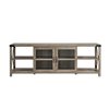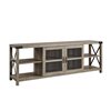 Find the ideal entertainment unit at the intersection between style and functionality with this metal "X" 70-in TV console. Putting an industrial spin on the farmhouse design trends this media console features open and closed storage that’s framed with exposed metal accents on the sides and top corners of the piece. Behind the tempered glass front doors with soft close hinges are adjustable shelves. The side shelves are fixed. This grey media stand features cord management options and can accommodate TVs up to 78-in.