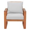 - This set includes: 4 wood outdoor chairs with cushions and one cocktail table