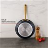 Discover the Lagostina Eleganza ceramic frypans, a collection that blends exquisite design with culinary innovation. Engineered with a 2-coat advanced ceramic non-stick interior, it ensures effortless cooking and cleanup, free from PFOA and PTFE. The sleek black metallic surface resists stains and facilitates food release with minimal oil, promoting healthier meals. With a ceramic coating 20 times harder than traditional non-stick, it allows the cookware to withstand higher temperatures. Crafted with a thick aluminum body, these frypans heat up swiftly and distributes heat evenly for superior cooking results, complemented by stay-cool gold stainless steel handles for a secure grip. Oven safe up to 450°F/ 232°C, it features a solid induction base for compatibility across all cooktops, exuding elegance in every detail.