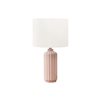 Beautify your space with this fashionable and stylish 23"h glossy pink ceramic table lamp. Composed of high-quality ceramic material in a chic ribbed design, this decorative lamp is complimented with a sophisticated ivory fabric shade that diffuses the light beautifully, generating a warm ambiance that brightens your end or side table, nightstand, or bedside table. Equipped with an easy on/off turn knob switch for effortless control, this lamp operates with a standard 100W bulb (not included) to create a welcoming atmosphere. Enjoy peace of mind with our 2 year limited warranty against manufacturer defects, ensuring a reliable and well-made lighting accent. Well suited to fit all decor styles, illuminate your living room, bedroom, or office with this versatile and on-trend table lamp with a columnar shape base, adding dimension to a room.