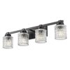 A dramatic look puts a new spin on sophisticated glam lighting as this 4-light vanity light begins with bold matte black finish steel framing. Its suspended clear glass shades with textural diamond patterning deliver a chic look with understated beauty, as convenient dimming functionality creates various selectable light levels.