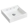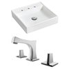 It features a square shape. This vessel set is designed to be installed as a wall mount vessel set. It is constructed with ceramic and it comes with an enamel glaze finish in white colour. It is designed for a 3h8-in. faucet.