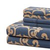 This king-size sheet set features a classic design with a navy-blue base and elegant gold floral damask, with matching prints on both pillowcases. The set includes one flat sheet (105 x 102-in), one deep pocket fitted sheet (78 x 80 + 14-in) that fits mattresses up to 16 inches, two pleated pillowcases, and two plain pillowcases (20 x 40-in). Made from an ultra-soft blend of 85% polyester and 15% bamboo rayon, the 120 GSM double-brushed fabric is breathable, wrinkle-resistant, prewashed, fade-resistant, hypoallergenic, and durable with no pilling. Its silky texture and breathable weave ensure long-lasting comfort. This printed sheet set is ideal for master bedrooms, guest rooms, cottages, or home staging, and makes a thoughtful gift for parents, partners, family members, or seniors. Easy care: machine wash in cold water, tumble dry on low. Wash whites and colours separately. Do not use bleach on colours.