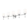 A sweep of gleaming chrome and five glowing shades brings a touch of penthouse glamour to even a simple bath. Because this chrome 5-light vanity light reflects tile, mirror, and hardware all at once, it turns the vanity wall into a lively focal point that sparkles during busy mornings and softens beautifully when dimmed at night.