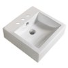 This square sink features a ceramic construction and is designed to be installed as a above counter vessel. This vessel comes with a white enamel glaze finish. This product is ideal for a 3h8-in. faucet.