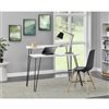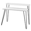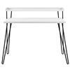Mix industrial and modern styles together to get the Haven Ameriwood Home retro desk with riser. This desk is perfect for smaller spaces with its small footprint and offers 2 levels of desk space with the added riser. The crisp white finish coordinates with almost any decor while the laminated particle board desktop and powder-coated metal hairpin legs give this desk a sturdy build along with a fun design.