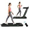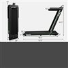 This 2-in-1 folding treadmill brings you a healthier lifestyle! This 2-in-1 treadmill with 2.25 HP motor can meet your daily workout needs with an adjustable speed range from 0.6-7.5 mph. And this running machine also serves as an under desk walking pad when the handrail is folded, which improves focus and work efficiency. With a mobile phone holder and a Bluetooth speaker, you are provided with more entertainment during workouts. The LED display shows basic sports data (time, speed, distance and calories), and the adjustment is easy to make with the remote control. Plus, this folding treadmill offers more online functions after connecting with the GYMAX app. To fold the treadmill, you only need to rotate the handlebar, fold down and close to lock the handrail, which is space saving for storage.