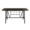 - The table features a brown wood table top and a dark gunmetal grey frame, for a two-tone mixed media finish