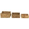 These baskets do not only add practicality but also add a natural touch to any space. Each basket is meticulously woven from sustainable fibres making them eco-friendly and durable. The warm brown tones complement various interior styles from rustic to modern seamlessly blending into your décor. Product Features: Set of 3 storage baskets. Solid brown rectangular baskets woven with natural fibres. Each basket comes with 2 built-in carrying handles. Perfect for use as laundry baskets or storage for stuffed animals clothing blankets and more. Recommended for indoor use only. Dimensions: Small: 4.75-in H x 11.75-in W x 7.75-in D; Medium: 6-in H x 13.5-in W x 9.75-in D; Large: 8-in H x 15.75-in W x 11.75-in D. Material(s): water hyacinth