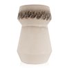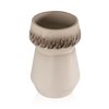This ceramic vase has a geometric, tapered shape with a wider base that narrows slightly before expanding into a broad, open mouth. The vase features distinctive dark brown and black markings that resemble a row of elongated leaves encircling the neck just below the lip, adding a decorative contrast to the otherwise minimalist design. The vase is available in two different sizes and is sold individually.