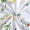 This king-size sheet set features a modern floral pattern with red, yellow, and purple flowers and green leaves on a crisp white background, with matching prints on both pillowcases. The set includes one flat sheet (105 x 102-in), one deep pocket fitted sheet (78 x 80 + 14-in) that fits mattresses up to 16 inches, two pleated pillowcases, and two plain pillowcases (20 x 40-in). Made from an ultra-soft blend of 85% polyester and 15% bamboo rayon, the 120 GSM double-brushed fabric is smooth to the touch, breathable, wrinkle-resistant, prewashed, fade-resistant, hypoallergenic, and durable with no pilling. Its breathable weave and silky texture provide long-lasting comfort. This printed sheet set is ideal for master bedrooms, guest rooms, cottages, or home staging, and makes a thoughtful gift for parents, partners, family members, or seniors. Easy care: machine wash in cold water, tumble dry on low. Wash whites and colours separately. Do not use bleach on colours.