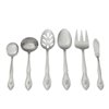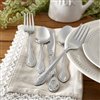 - Set includes: 8 dinner forks, 8 dinner spoons, 8 salad forks, 8 teaspoons, 8 dinner knives, 1 serving spoon, 1 slotted serving spoon, 1 gravy ladle, 1 serving fork, 1 butter knife, 1 sugar spoon